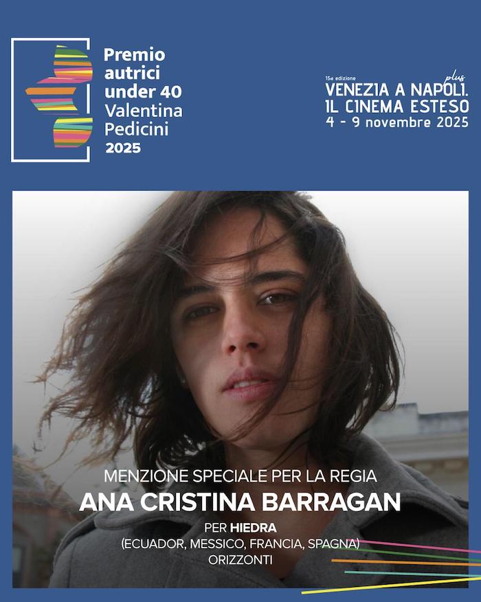 Venerdì 5 settembre 2025 sono stati assegnati i riconoscimenti nell’ambito del Premio Autrici under 40 dedicato alla regista Valentina Pedicini, prematuramente scomparsa nel novembre del 2020, e rivolto alle autrici che si sono distinte per il loro talento in regia, sceneggiatura, montaggio e direzione della fotografia per i film selezionati nella 82. Mostra Internazionale d’Arte Cinematografica di Venezia nelle Sezioni Orizzonti, Giornate degli Autori e Settimana della Critica.